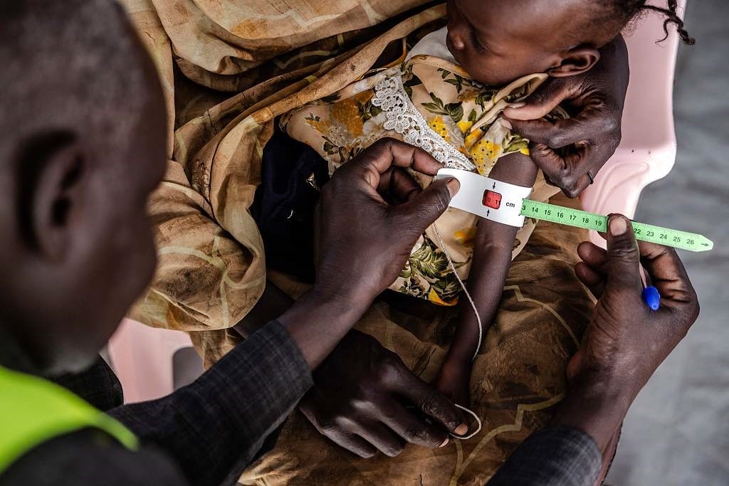 當(dāng)?shù)貢r間2024年2月13日,南蘇丹,在難民中轉(zhuǎn)中心的診所里,一名醫(yī)護(hù)工作人員在測量一名蘇丹兒童的手臂周長。
