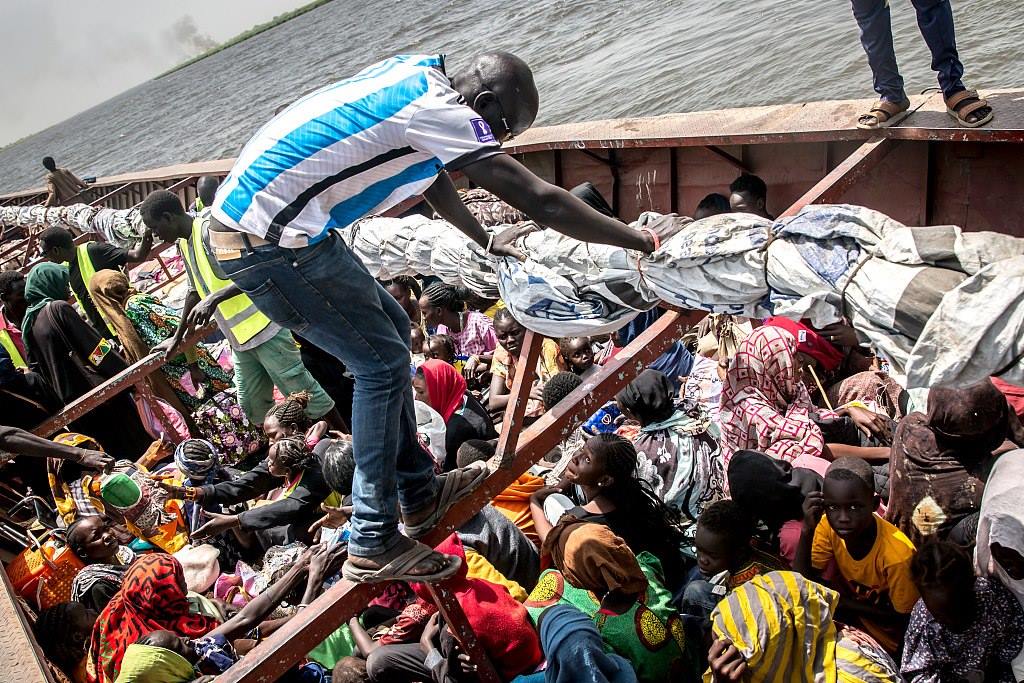 當(dāng)?shù)貢r間2024年3月21日,人們坐上船只抵達(dá)南蘇丹,逃離沖突。