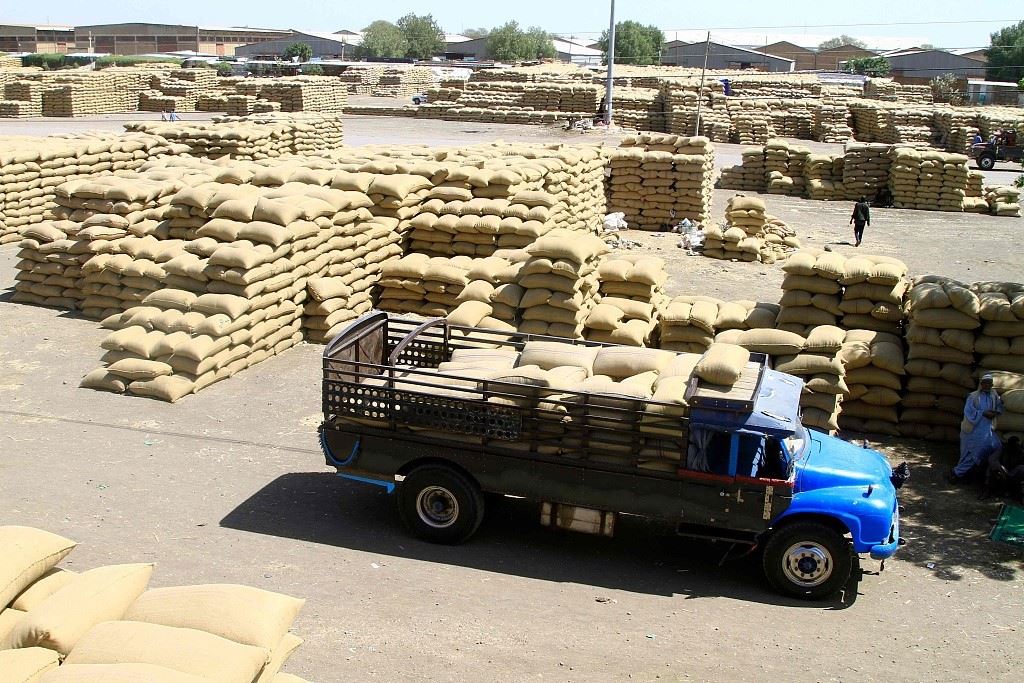 當(dāng)?shù)貢r間2024年2月22日,蘇丹東部杰達(dá)雷夫市,卡車在一個市場里運(yùn)送谷物。聯(lián)合國糧食計劃署表示,蘇丹長期武裝沖突導(dǎo)致當(dāng)?shù)亟^大多數(shù)人都面臨饑餓。