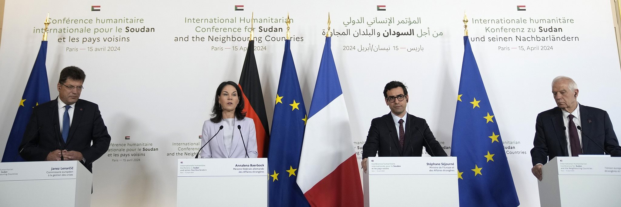 當(dāng)?shù)貢r間2024年4月15日,法國巴黎,法國外交部長斯特凡納·塞茹爾內(nèi)(右二),德國外交部長安娜萊娜·貝爾伯克,歐盟危機(jī)管理專員約翰·萊納西奇(左)和歐盟外交與安全事務(wù)高級代表何塞普·博雷利參加了蘇丹及其鄰國國際人道主義會議的聯(lián)合新聞發(fā)布會。