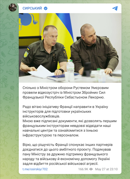 5月27日,烏克蘭武裝部隊(duì)總司令亞歷山大·瑟爾斯基(Oleksandr Syrskyi)在Telegram平臺(tái)上發(fā)文,稱法國(guó)有意向?yàn)蹩颂m派遣教官,培訓(xùn)烏軍人員,并表示已簽署相關(guān)文件,允許首批法國(guó)教官訪問(wèn)烏軍培訓(xùn)中心。