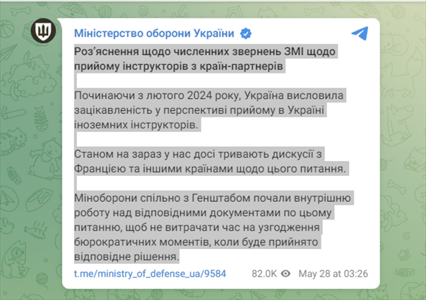 5月28日,烏克蘭國(guó)防部在Telegram上發(fā)文稱,到目前為止仍在就接受伙伴國(guó)教員一事,與法國(guó)和其他國(guó)家進(jìn)行討論。