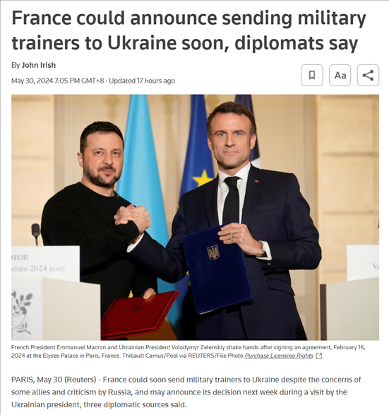 5月30日,路透社援引三位匿名外交消息人士稱,盡管仍有顧慮,但法國(guó)可能很快會(huì)向?yàn)蹩颂m派遣軍事教官,并可能在下周烏克蘭總統(tǒng)訪問(wèn)期間宣布這一決定。