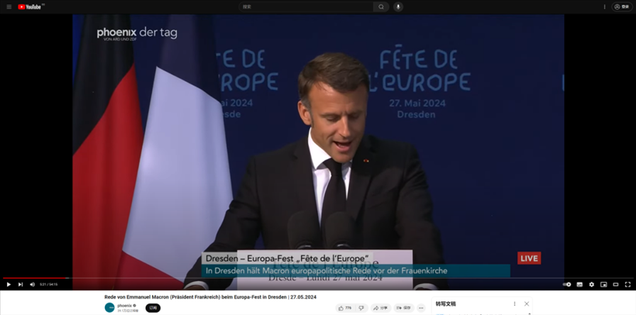 Phoenix在其YouTube頻道上播出的馬克龍演講的完整版本截圖。網(wǎng)傳視頻顯示的音頻內(nèi)容與Phoenix播出的馬克龍?jiān)诘吕鬯诡D進(jìn)行演講時(shí)開(kāi)篇的音頻一致,且拍攝現(xiàn)場(chǎng)的環(huán)境高度吻合。