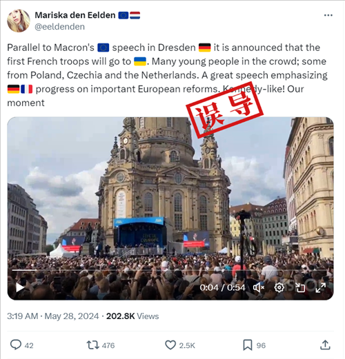 X平臺(tái)用戶@NinaHaase在28日凌晨2點(diǎn)03分發(fā)布的推文截圖,稱“現(xiàn)在,法國(guó)總統(tǒng)埃馬紐埃爾·馬克龍正在德累斯頓發(fā)表演講,他開(kāi)場(chǎng)用了德語(yǔ)”,沒(méi)有提到法國(guó)軍隊(duì)。