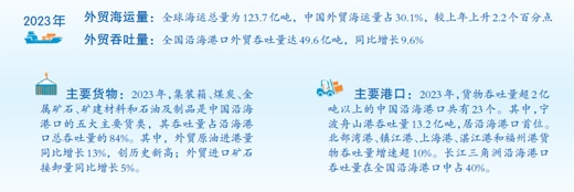 在全球范圍內(nèi),超八成的國(guó)際貿(mào)易通過(guò)海上運(yùn)輸實(shí)現(xiàn),海運(yùn)是中國(guó)外貿(mào)的“大動(dòng)脈”?!吨袊?guó)港口運(yùn)行分析報(bào)告(2024)》(以下簡(jiǎn)稱《報(bào)告》)顯示,2023年,在外貿(mào)需求回暖、全球貿(mào)易體系重塑等因素推動(dòng)下,中國(guó)外貿(mào)海運(yùn)規(guī)模增長(zhǎng)較快,全國(guó)沿海港口外貿(mào)吞吐量達(dá)49.6億噸,同比增長(zhǎng)9.6%。