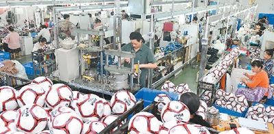 湖南省邵陽市洞口縣工業(yè)園區(qū),金美達體育用品有限公司員工在生產(chǎn)足球,趕制出口訂單產(chǎn)品。滕治中攝(人民視覺)