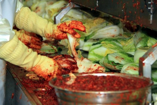 2011年12月8日,在韓國慶尚南道居昌郡韓國著名泡菜公司“宗家府”的工廠內,工人們將調制好的配料抹到整棵的大白菜上。新華社記者何璐璐攝