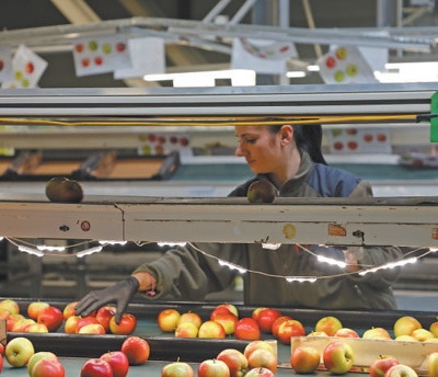 波蘭格魯耶茨縣一家蘋(píng)果加工企業(yè)內(nèi),當(dāng)?shù)毓と苏诜謷O(píng)果。本報(bào)記者 禹麗敏攝