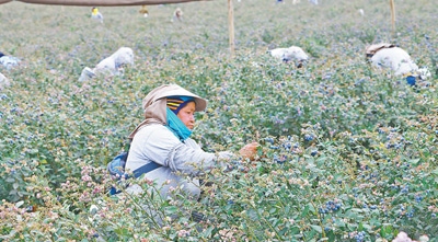 秘魯特魯希略市一家農(nóng)場(chǎng)內(nèi),工人們?cè)诓烧{(lán)莓。本報(bào)記者 顏 歡攝