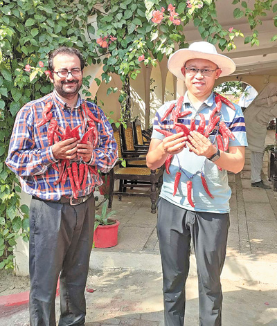 參與中國—巴基斯坦辣椒種植合作項(xiàng)目的中國專家與當(dāng)?shù)丶夹g(shù)員共同慶祝辣椒豐收。本報(bào)巴基斯坦分社 瓦卡斯·阿赫邁德攝