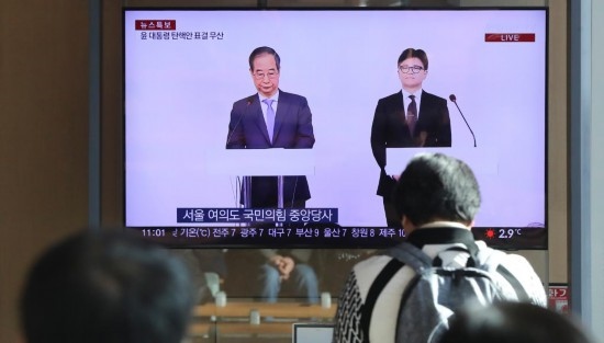 12月8日,在韓國(guó)首爾火車站,民眾觀看韓國(guó)執(zhí)政黨黨首韓東勛與國(guó)務(wù)總理韓德洙(左)共同會(huì)見(jiàn)記者的電視直播。新華社記者 姚琪琳 攝
