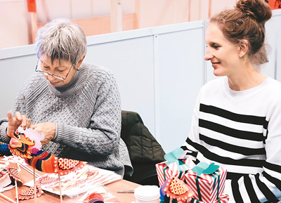 觀眾在博覽會現(xiàn)場體驗(yàn)中國龍工藝品制作。