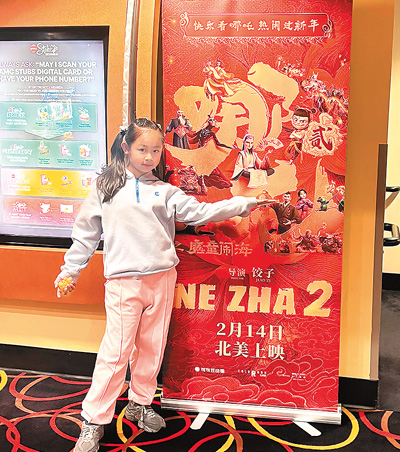圖為唐夢竹的女兒在美國洛杉磯一家影院的《哪吒之魔童鬧?!沸麄骱?bào)前留影。