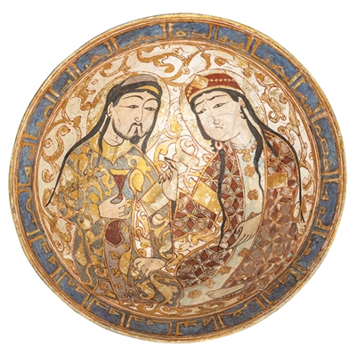 米納伊彩人物花卉銘文釉陶碗為核心展品之一。它產(chǎn)于公元12—13世紀(jì),內(nèi)壁中央繪有一對(duì)戀人,這是古代伊朗常見(jiàn)的藝術(shù)插圖題材。這對(duì)戀人的形象具有明顯的東亞人特征,男子手中握著一個(gè)精致的酒杯,似乎在向他的愛(ài)人敬酒。人物周圍環(huán)繞著平行和扭曲的阿拉伯式花紋,碗口在一圈鈷藍(lán)底上飾有金色庫(kù)法體文字。