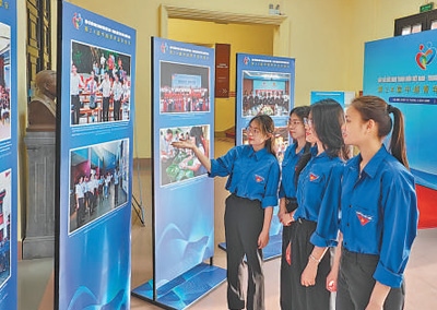 4月14日,越南青年參觀在河內(nèi)舉行的中越青年交流合作圖片展。?