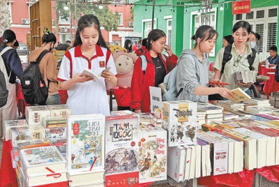 4月9日,越南河內(nèi)大學(xué)孔子學(xué)院學(xué)生在翻閱越南語版的中國傳統(tǒng)經(jīng)典名著。