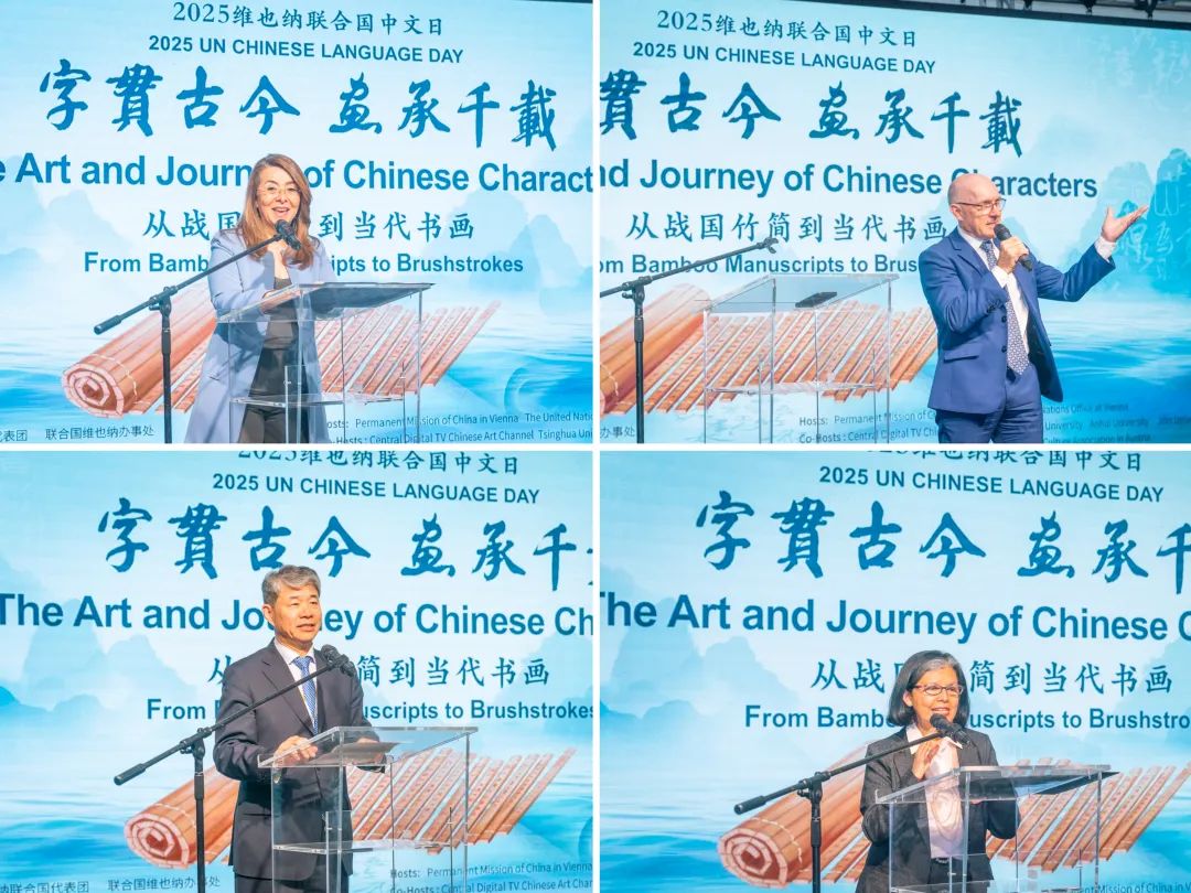 此次中文日活動以“字貫古今 畫承千載——從戰(zhàn)國竹簡到當代書畫”為主題,由中國常駐維也納代表團、聯(lián)合國維也納辦事處主辦,中央數(shù)字電視書畫頻道、清華大學、安徽大學、吉林大學協(xié)辦,共同為維也納聯(lián)合國總部獻上了一場中國文化盛宴。清華大學副校長彭剛、中央數(shù)字電視書畫頻道董事局主席王平在開幕式致辭,探討了文字、文化、文明三者之間的緊密關(guān)系和文明交流互鑒的重要意義。
