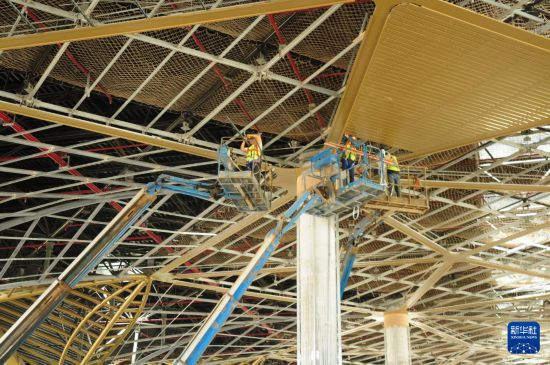 4月8日,建筑工人在伊拉克濟(jì)加爾省納西里耶國(guó)際機(jī)場(chǎng)項(xiàng)目主航站樓內(nèi)部施工作業(yè)。新華社記者 段敏夫 攝