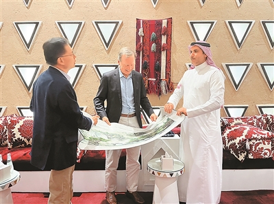 尼爾·布什(中)與Skytower Investments首席執(zhí)行官方洪(左),向沙特阿拉伯國家工業(yè)發(fā)展與物流計劃署首席執(zhí)行官蘇萊曼·本·哈立德·馬茲魯阿(右)贈送中國絲綢畫卷。