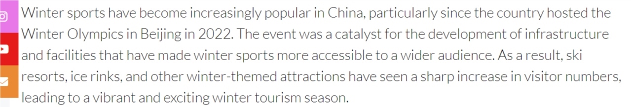文章說,自2022年北京冬奧會(huì)成功舉辦以來,冰雪運(yùn)動(dòng)在中國越來越受歡迎。冬奧效應(yīng)帶動(dòng)了基礎(chǔ)設(shè)施的完善,讓更多人得以接觸冰雪項(xiàng)目。如今,滑雪場(chǎng)、冰場(chǎng)和其他冬季主題景點(diǎn)客流量大幅增長,造就了充滿活力、令人興奮的冰雪旅游季。