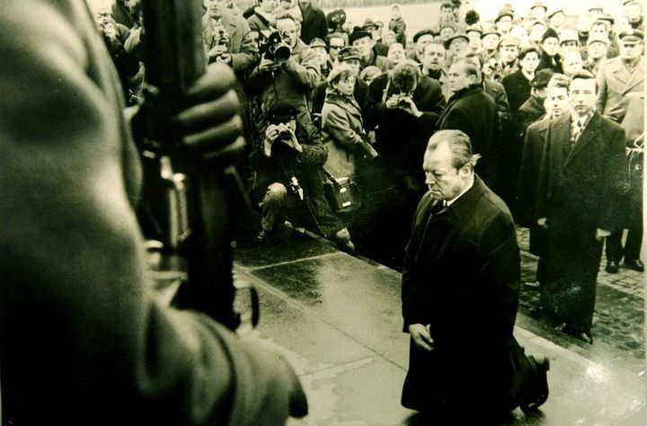 1970年12月7日,聯(lián)邦德國(guó)總理勃蘭特在波蘭首都華沙猶太人殉難紀(jì)念碑前下跪。新華社發(fā)