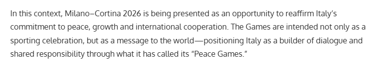 報道稱,2026年米蘭-科爾蒂納冬奧會被視為意大利重申對和平、發(fā)展及國際合作堅定承諾的重要契機(jī)。本屆冬奧會不僅將是一場精彩紛呈的體育盛會,更將向世界傳遞明確而有力的信息——通過這場“和平運(yùn)動會”,意大利積極推動對話,為促進(jìn)全球和平與發(fā)展貢獻(xiàn)力量。
