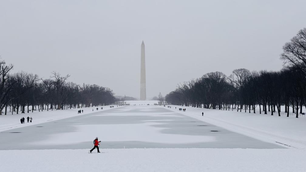 1月25日,人們在美國首都華盛頓林肯紀念堂倒影池旁的雪中行走。新華社記者徐劍梅攝