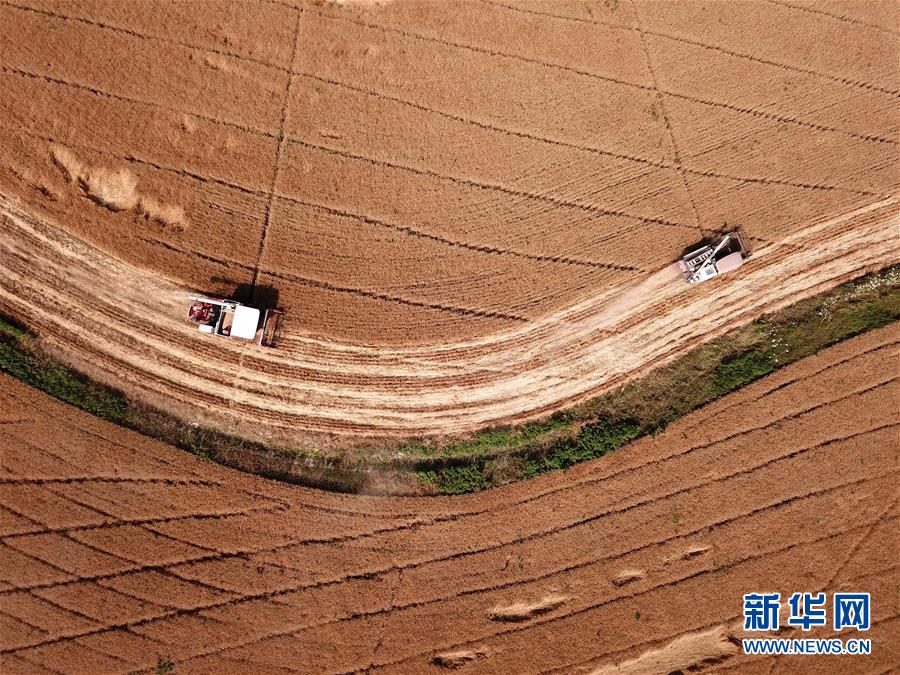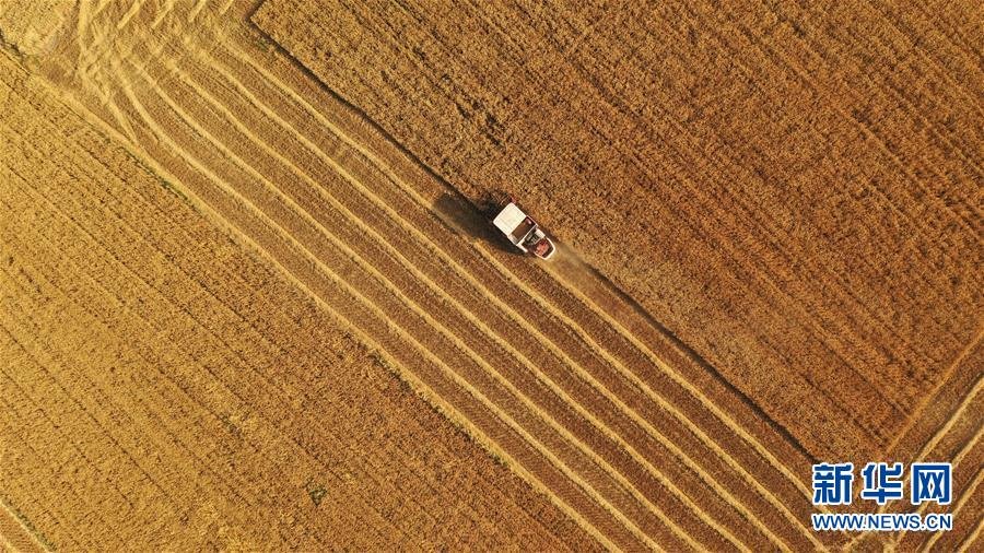 6月2日,在合肥市蜀山區(qū)小廟鎮(zhèn)馬崗村,農(nóng)機(jī)手操作機(jī)械設(shè)備收割小麥(無人機(jī)照片)。 “三夏”時節(jié),安徽各地麥?zhǔn)者M(jìn)入高峰期,農(nóng)民搶收小麥,確保顆粒歸倉。新華社記者劉軍喜攝