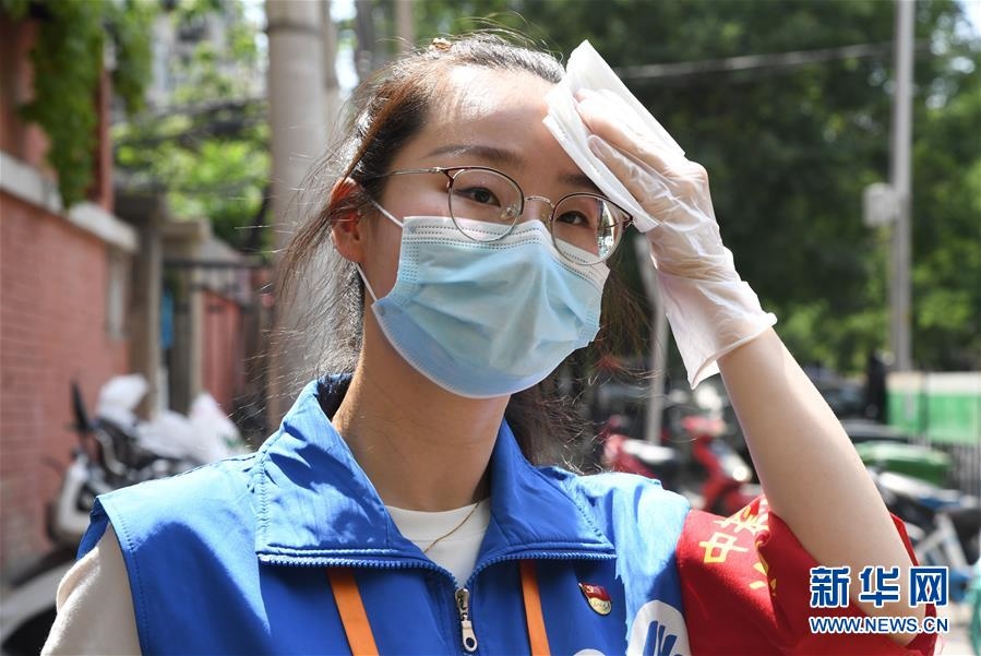 6月16日,在北京市海淀區(qū)中關村街道白塔庵社區(qū)出入口,疫情防控志愿者王玥在擦拭汗水。連日來,北京出現(xiàn)高溫天氣??崾钪校ぷ魅藛T堅守抗擊疫情一線,成為烈日下的“逆行者”。新華社記者任超攝