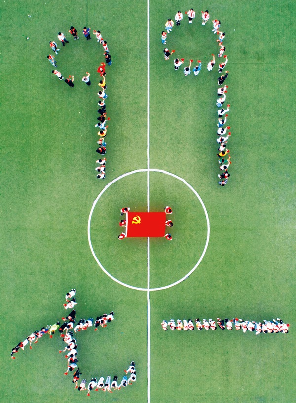 2020年6月30日,江蘇省泰州市大馮中心小學開展“童心向黨迎七一”主題班會,通過給學生上黨課、講黨史等方式,讓學生了解黨的光輝歷程,迎接中國共產(chǎn)黨建黨99周年。圖為活動中擺出的“七一”、“99”和黨旗的組合圖案。中新社發(fā)湯德宏/攝