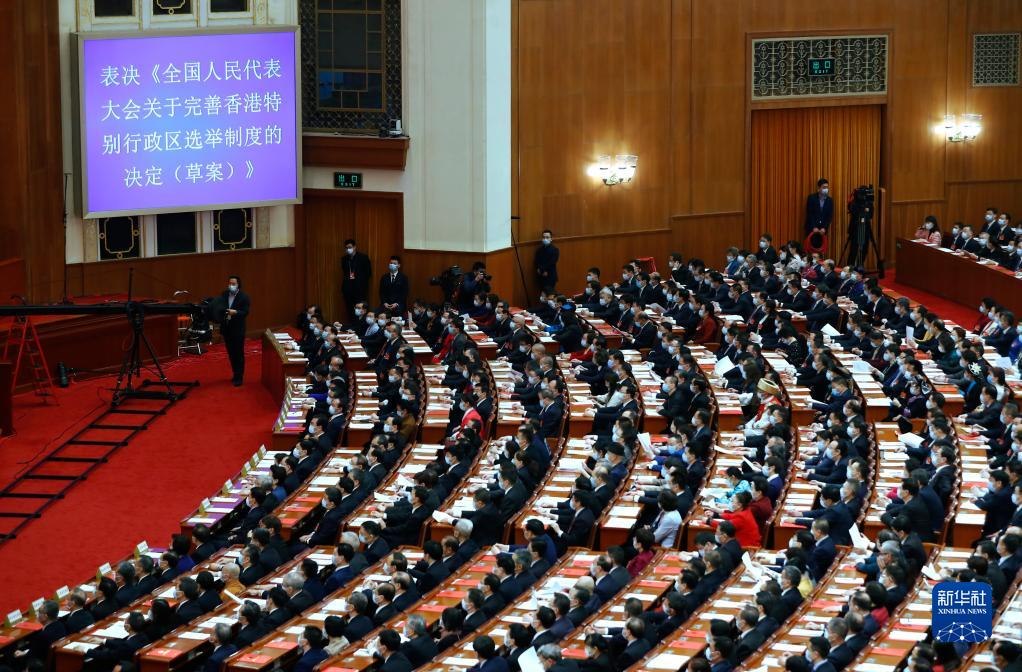 3月11日,十三屆全國人大四次會議表決通過《全國人民代表大會關于完善香港特別行政區(qū)選舉制度的決定》。這是繼制定實施香港國安法后,中央依法治港的又一重大舉措,是完善“一國兩制”制度體系、落實中央對香港全面管治權的具體體現(xiàn),為全面落實“愛國者治港”原則提供了更加堅實的制度保障。3月30日,十三屆全國人大常委會第二十七次會議通過了新修訂的香港基本法附件一和附件二。隨后,香港特別行政區(qū)完成本地立法。新選舉制度為推進香港民主穩(wěn)步發(fā)展、實現(xiàn)良政善治,促進“一國兩制”實踐行穩(wěn)致遠打下堅實基礎。