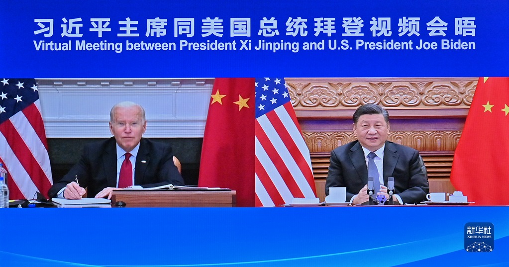 這是2021年11月16日上午,國家主席習近平在北京同美國總統(tǒng)拜登舉行視頻會晤。新華社記者 岳月偉 攝