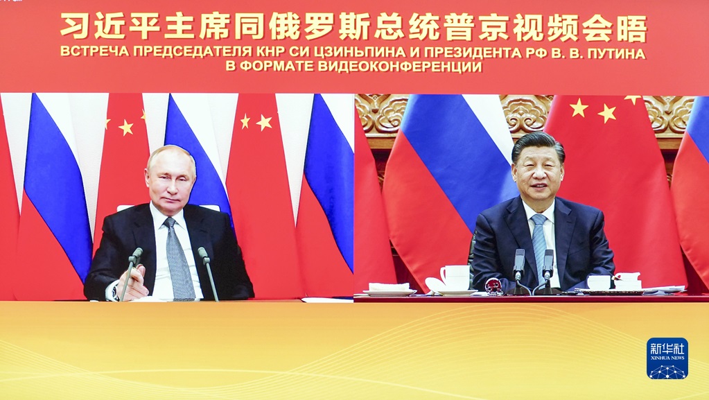 這是2021年12月15日下午,國家主席習近平在北京同俄羅斯總統(tǒng)普京舉行視頻會晤。新華社記者 殷博古 攝