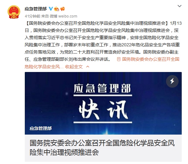 據(jù)應(yīng)急管理部官方微博消息,近日國務(wù)院安委會(huì)辦公室召開全國危險(xiǎn)化學(xué)品安全風(fēng)險(xiǎn)集中治理視頻推進(jìn)會(huì),會(huì)議明確指出要保持高度警覺,加強(qiáng)監(jiān)督檢查和明查暗訪,落實(shí)各項(xiàng)安全防范措施,嚴(yán)格領(lǐng)導(dǎo)帶班和值班值守,切實(shí)抓好歲末年初?;钒踩a(chǎn)工作,堅(jiān)決防范各類事故發(fā)生。