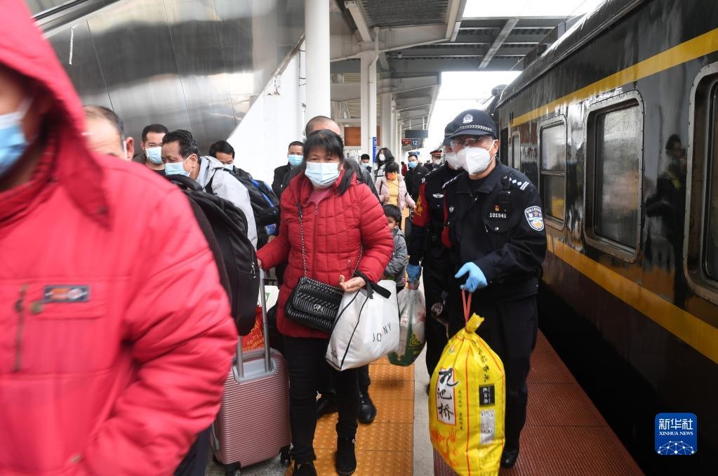 在湛江開(kāi)往南寧的列車外,南寧鐵路公安局南寧公安處乘警支隊(duì)民警張洪手執(zhí)喇叭引導(dǎo)旅客有序上車(2月19日攝)。新華社記者 陸波岸 攝