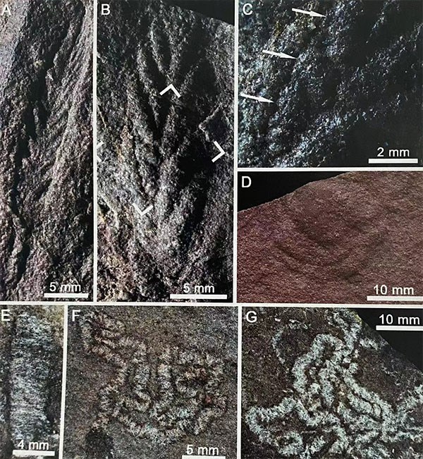 圖為全吉山生物群的代表性埃迪卡拉化石恰尼蟲(chóng)(A-C)、盾盤蟲(chóng)(D)和陜西跡(E-G)