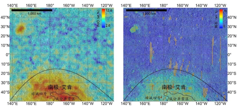 月球表面主要物質(zhì)組分是輝石和橄欖石,南極-艾肯盆地底部的物質(zhì)成分出現(xiàn)異常,鎂鐵質(zhì)硅酸鹽礦物含量以及鐵含量顯著高于盆地外圍區(qū)域(圖1)。