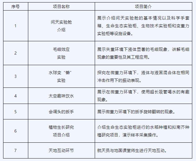 本次太空授課活動將繼續(xù)采取天地互動方式進(jìn)行,3名航天員將在軌介紹展示中國空間站問天實(shí)驗艙工作生活場景,演示微重力環(huán)境下毛細(xì)效應(yīng)實(shí)驗、水球變“懶”實(shí)驗、太空趣味飲水、會調(diào)頭的扳手以及植物生長研究項目介紹,并與地面課堂進(jìn)行互動交流(授課內(nèi)容介紹附后),旨在傳播普及載人航天知識,激發(fā)廣大青少年對科學(xué)的興趣。