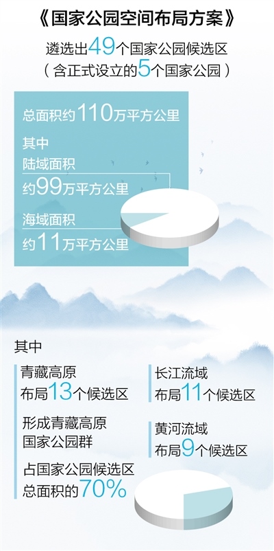 在空間布局上,遴選出49個(gè)國(guó)家公園候選區(qū)(含正式設(shè)立的5個(gè)國(guó)家公園),總面積約110萬平方公里,其中陸域面積約99萬平方公里、海域面積約11萬平方公里,占陸域國(guó)土面積的10.3%。充分銜接國(guó)家重大戰(zhàn)略和重大生態(tài)工程,其中,青藏高原布局13個(gè)候選區(qū),形成青藏高原國(guó)家公園群,占國(guó)家公園候選區(qū)總面積的70%;長(zhǎng)江流域布局11個(gè)候選區(qū),黃河流域布局9個(gè)候選區(qū)。全部建成后,中國(guó)國(guó)家公園保護(hù)面積的總規(guī)模將居世界第一。