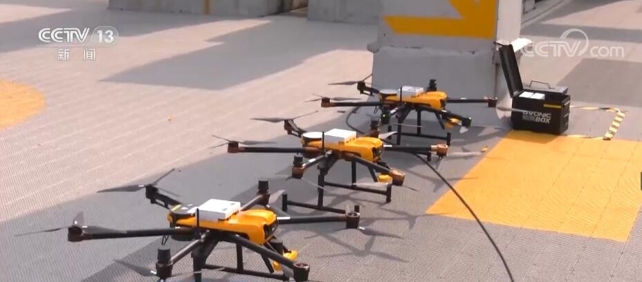 中午11點,在深圳一家商場頂層的平臺上,一架架無人機整齊停放在“停機坪”,工作人員將傳送帶上的外賣掃碼、裝箱,再掛上無人機就準(zhǔn)備起飛。在幾公里外的目的地,有智能空投柜等待接收,降落后顧客憑取件碼取餐,方便安全。