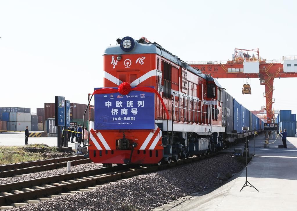 2021年11月23日,滿載著100個標(biāo)箱的“僑商號”中歐(義新歐)班列從鐵路義烏西站出發(fā),駛向西班牙首都馬德里。