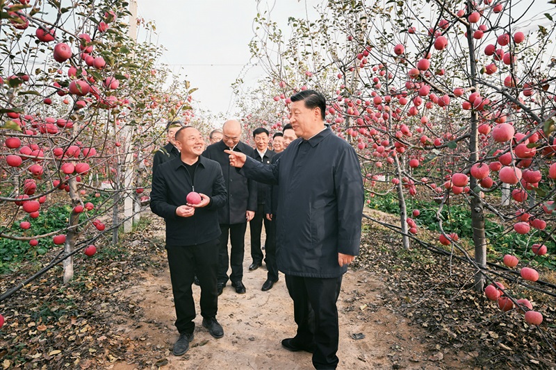 2022年10月26日至28日,中共中央總書記、國家主席、中央軍委主席習(xí)近平在陜西省延安市、河南省安陽市考察。這是26日下午,習(xí)近平在延安市安塞區(qū)高橋鎮(zhèn)南溝村蘋果園同老鄉(xiāng)們親切交流。 新華社記者 燕雁/攝