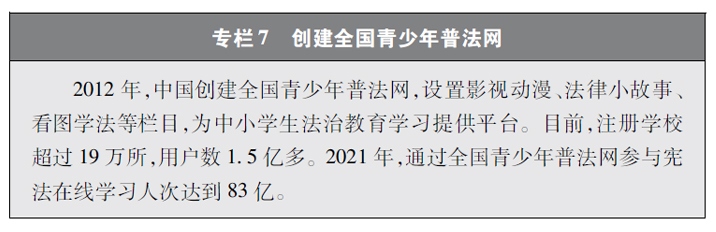 加強(qiáng)青少年網(wǎng)絡(luò)法治宣傳教育。青少年是祖國(guó)的未來(lái)、民族的希望。青少年網(wǎng)民在中國(guó)網(wǎng)民中的占比逐步增長(zhǎng)。作為互聯(lián)網(wǎng)的“原住民”,青少年是網(wǎng)上學(xué)習(xí)、交流、生活最活躍的參與者、實(shí)踐者,其合法權(quán)益也更易受到網(wǎng)絡(luò)違法活動(dòng)的侵害。中國(guó)從保護(hù)青少年網(wǎng)絡(luò)權(quán)益,促進(jìn)青少年健康成長(zhǎng)、全面發(fā)展出發(fā),遵循青少年身心發(fā)展規(guī)律,貼近青少年學(xué)習(xí)生活實(shí)際,聚焦網(wǎng)絡(luò)沉迷、網(wǎng)絡(luò)欺凌、網(wǎng)絡(luò)淫穢色情信息等重點(diǎn)問(wèn)題,通過(guò)普法微綜藝、兒童普法話劇、網(wǎng)絡(luò)普法故事廣播、網(wǎng)絡(luò)普法云課堂、學(xué)法用法知識(shí)競(jìng)賽、法治副校長(zhǎng)進(jìn)校園、編寫(xiě)網(wǎng)絡(luò)普法讀本等生動(dòng)活潑、豐富多彩的形式開(kāi)展法治宣傳教育,逐步形成了政府、社會(huì)、學(xué)校、家庭相結(jié)合的法治宣傳教育格局,為提升青少年網(wǎng)民法治意識(shí)和網(wǎng)絡(luò)安全素養(yǎng)提供了全面保障。