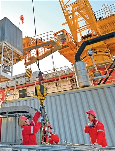 ▲ 埕海一號(hào)海上采油平臺(tái)工作人員在平臺(tái)甲板進(jìn)行吊裝作業(yè)(2023年1月16日攝) 趙子碩攝