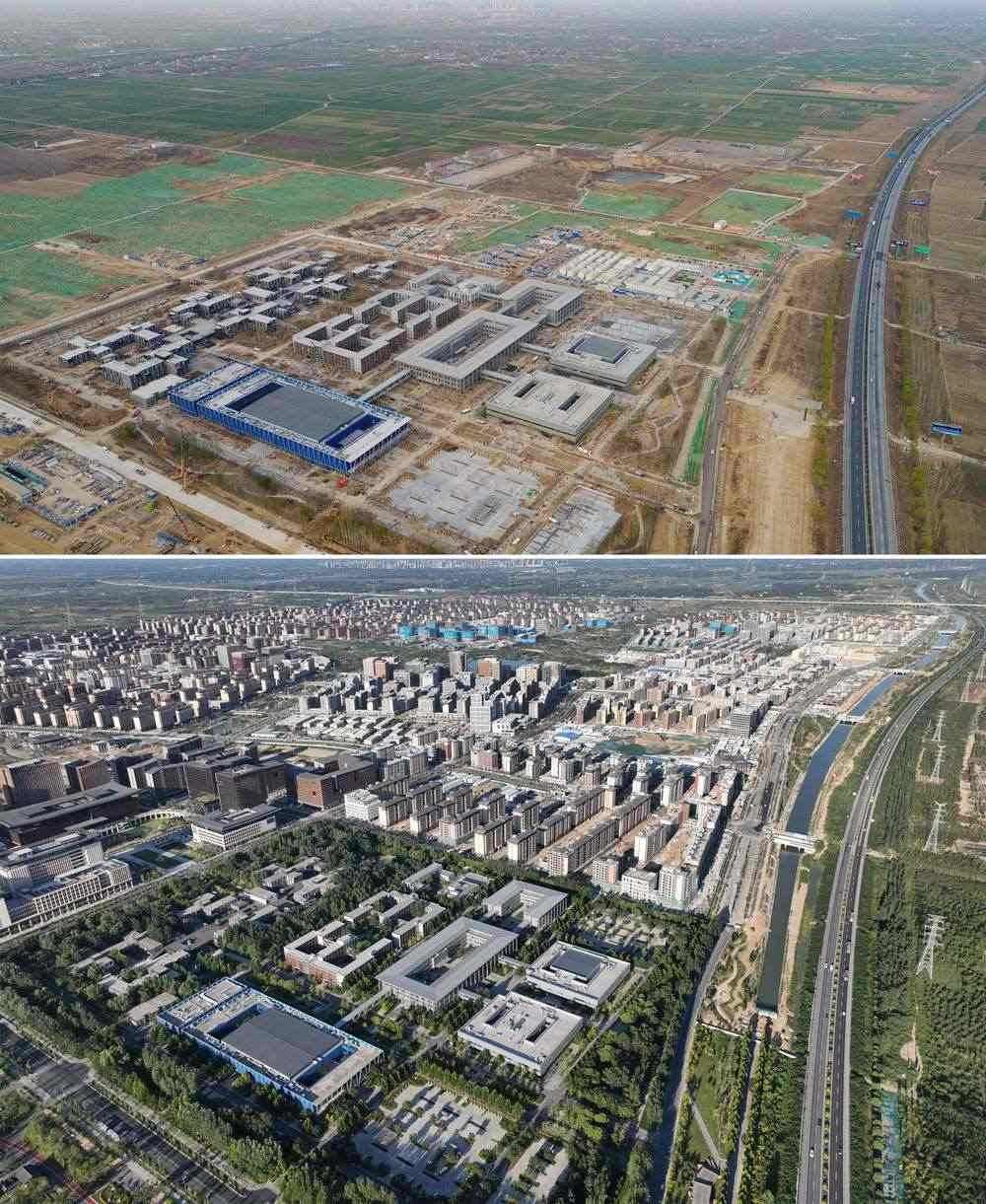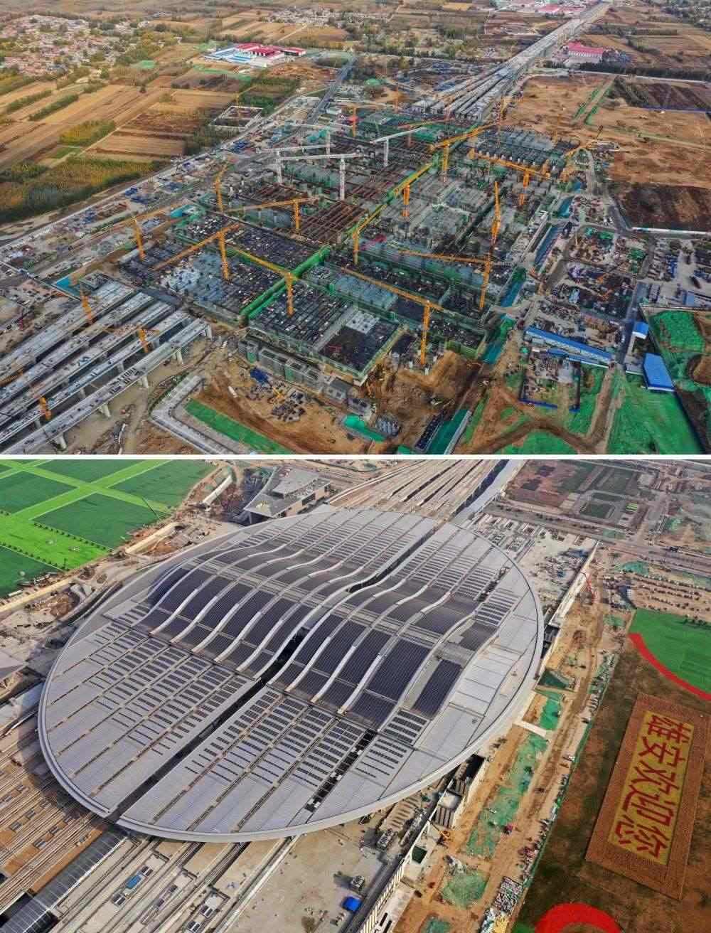 拼版照片:上圖為建設(shè)中的雄安站(無(wú)人機(jī)照片,2019年11月7日攝);下圖為建成的雄安站(無(wú)人機(jī)照片,2021年4月1日攝)。