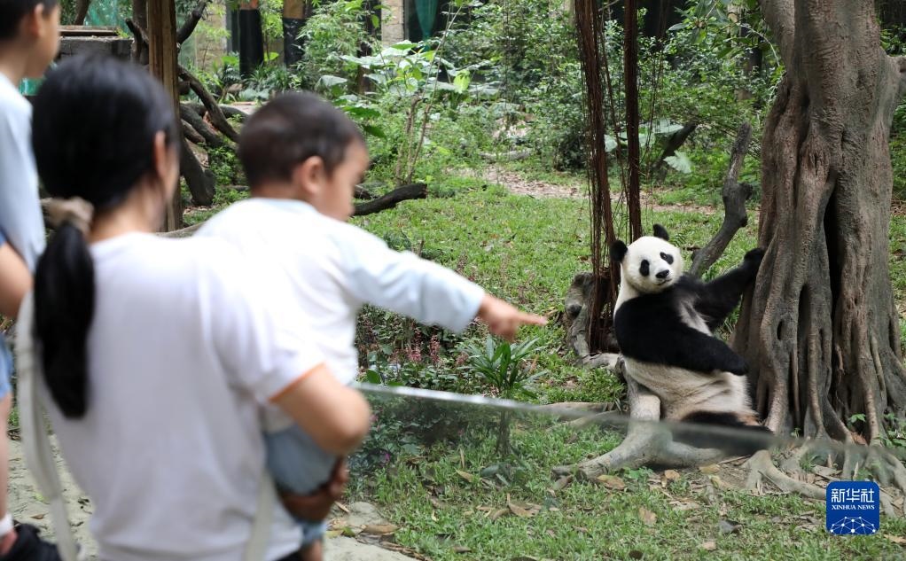 4月29日,在廣東廣州長隆野生動(dòng)物世界,游客在觀賞大熊貓。