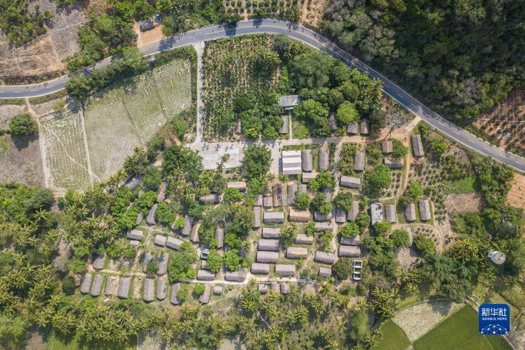 4月28日在海南省東方市白查村拍攝的黎族船型屋及近年修建的道路(無人機(jī)照片)。