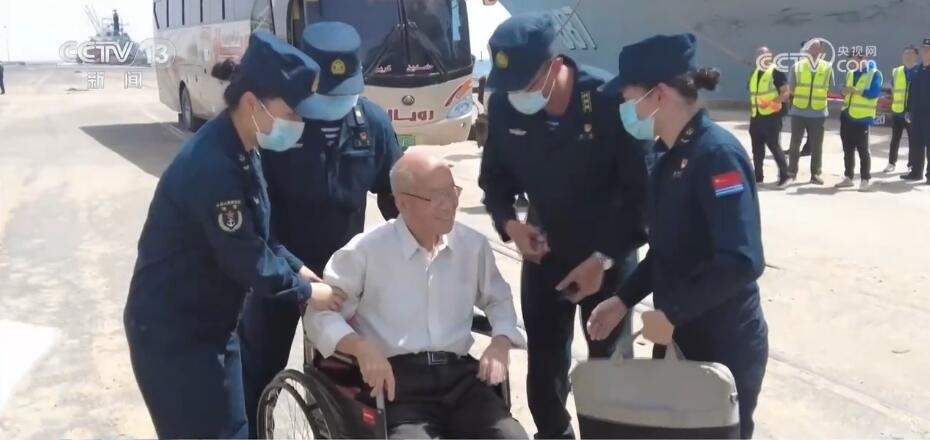 84歲的蘇丹華僑張緒富腿腳不便,接到大使館通知后,微山湖艦官兵提前準(zhǔn)備好了輪椅。張老抵達碼頭后,官兵們用輪椅推著張老登記、安檢后,攙扶著他登上軍艦。