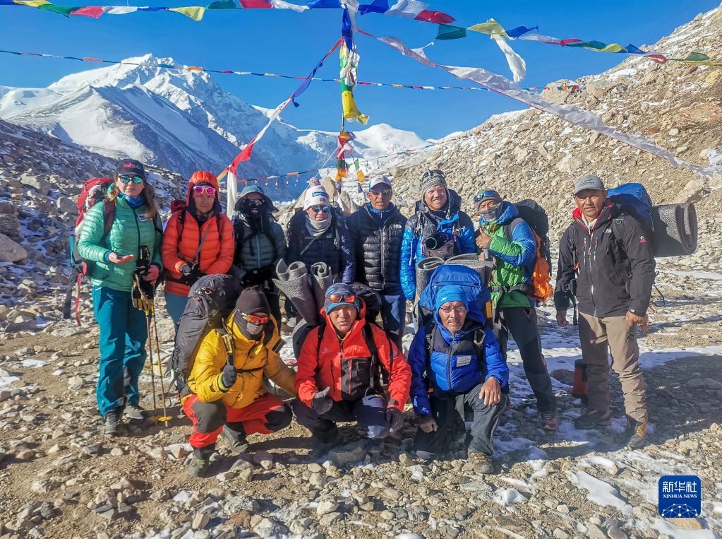 董紅娟(后排左三)在開(kāi)始攀登希夏邦馬峰前與隊(duì)友合影留念(4月23日攝)。新華社發(fā)(頓巴 攝)